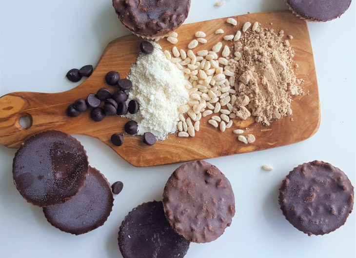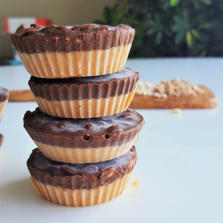 In a medium bowl combine 1 cup of peanut butter and ¼ cup of protein powder. Add water as needed to achieve a consistency similar to peanut butter. Prepare a muffin tin with 12 cupcake liners and evenly distribute the peanut butter mixture. Freeze until solid to the touch.
