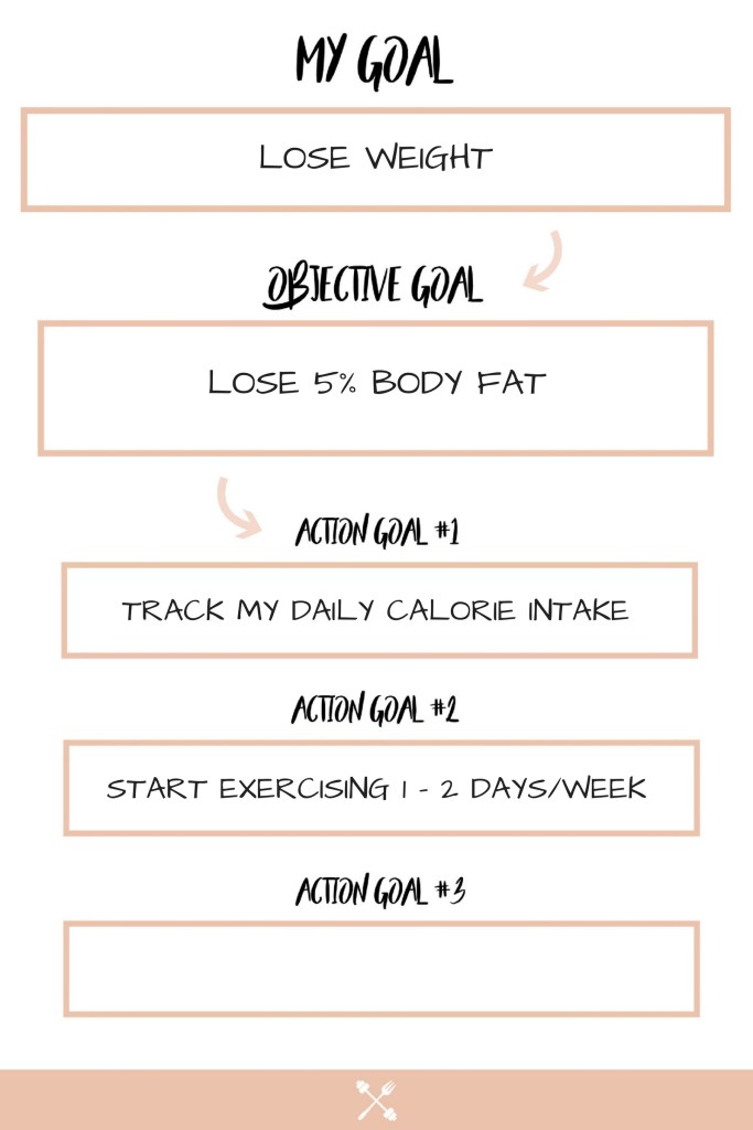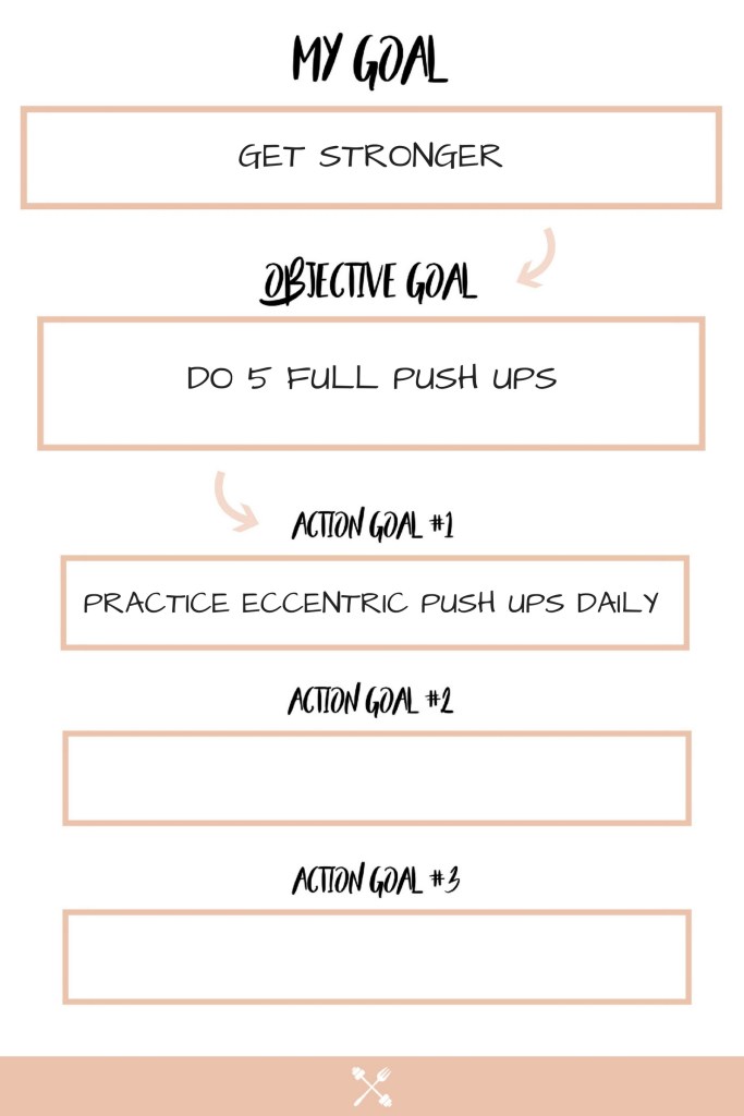 These are the small steps you will take daily and/or weekly to reach and complete your objective goals. An example could be strengthening the muscles that are used in a push up, going for a run 2-3x per week, drinking enough water, eating vegetables at every meal, or doing a strength-based workout 3x a week.