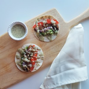 - To make this a salad, combine all finished ingredients in a bowl, without the tortillas. Thin out the hummus topping with more water for your salad dressing.