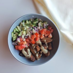 To assemble, add chicken and desired toppings to a wrap. Finish by drizzling with the hummus dressing. Serves 2 -3.