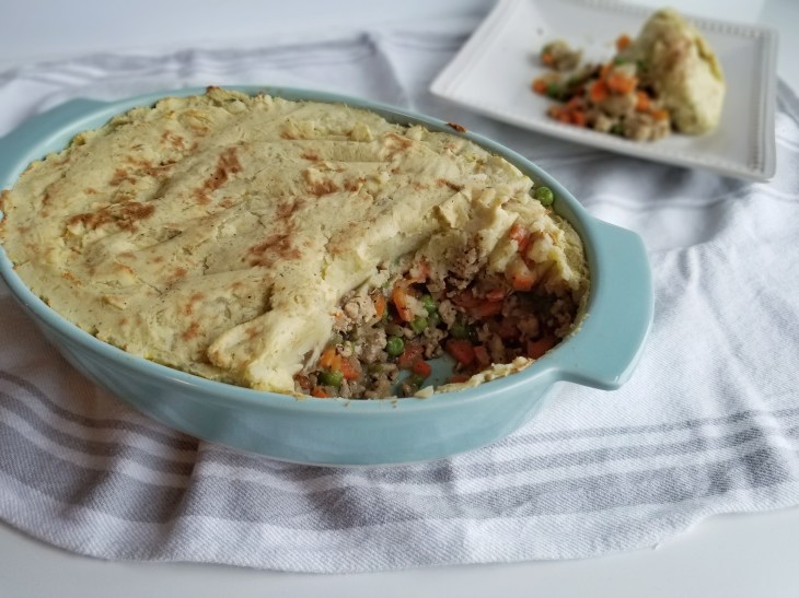 - Transfer meat and veggie mixture to a casserole dish. Top with mashed potatoes (or cauliflower) and spread evenly.
