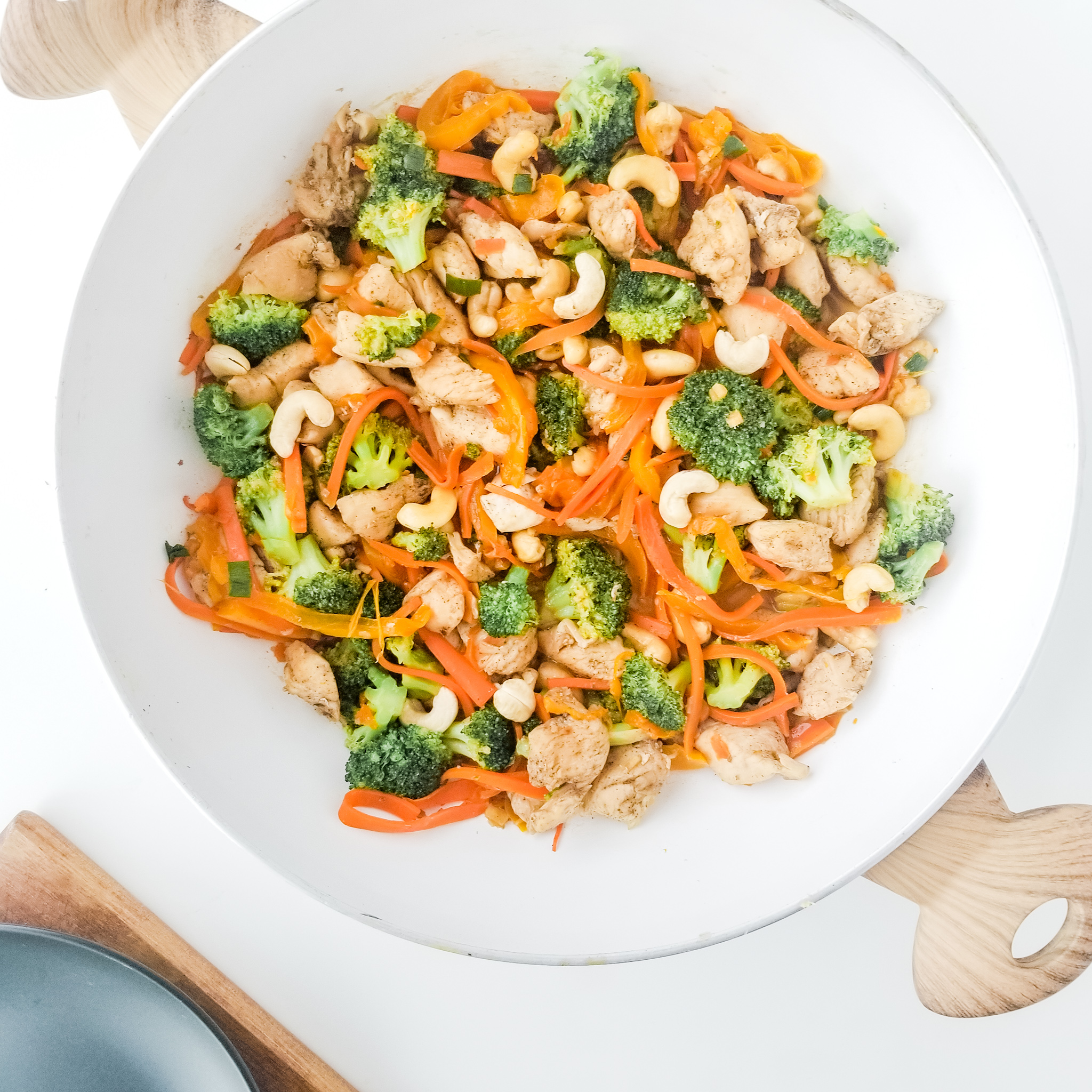 - Next add the broccoli, bell pepper, and carrots to the skillet. Cook until veggies are tender and chicken is cooked through. Then add the cashews and green onions.